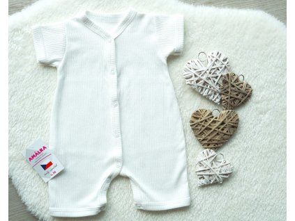 Lehký letní overal s krátkými nohavicemi a jemným ažurovým vzorem v smetanové barvě.